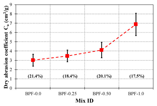 where is the dry abrasion coefficient (expressed in cm2/g), is the brushed area, is the mass before brushing, and is the mass after brushing. For each earthen mix, the AV, SD, and COV of dry abrasion coefficient values were estimated at 28 days after casting.