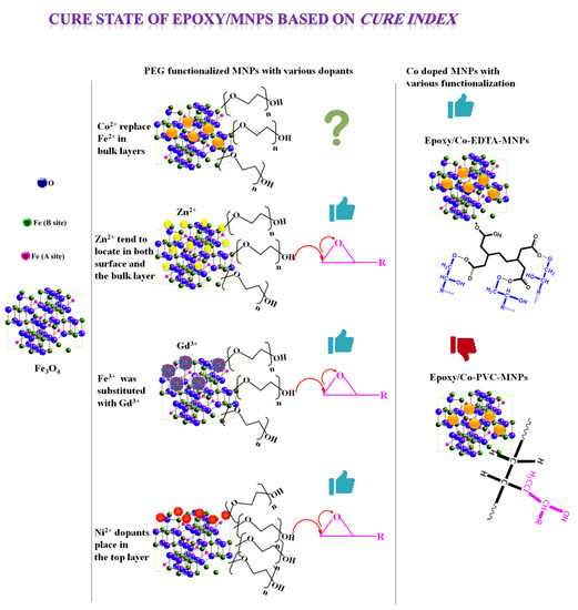 Electrochemical methods have been practiced for years to synthesize different types of nanoparticles [10,11,12,13]. It was reported that the superparamagnetic nature of nanoparticles can be altered by doping metal cations [14,15]. In a similar manner, surface modification of magnetite nanoparticles (MNPs) with polymers has rendered MNPs exhibiting proper physicochemical characters and magnetic behavior [16,17,18,19]. In this regard, surface coating with polyethylene glycol (PEG), polyethylenimine, polyvinylpyrrolidone and polyvinyl alcohol polymers have been addressed [20,21,22]. However, the high potential of MNPs to agglomerate is known as a deterrent against epoxy network formation. It has been found that Zn2+ [23] dopants in the structure of Fe3O4 can position in the bulk at the surface of Fe3O4 crystals (Figure 1). When epoxy is cured with PEG functionalized Zn-doped MNPs, the Poor cure state was changed to Good cure, as measured by the Cure Index, which was inferred to be due to the contribution of OH groups of PEG as well as Zn2+ Lewis acid precursors to epoxy ring opening [24]. By contrast, the Ni2+ dopants mainly locate on the top layer of Fe3O4 crystal that significantly activate the MNPs surface [25]. Good cure state is the result of PEG functionalization of Ni2+-doped Fe3O4 nanoparticles [16]. The curing reaction in epoxy system similarly improved in the epoxy system containing 0.1 wt.% PEG-functionalized gadolinium (Gd)-doped Fe3O4 when Fe3+ was partially replaced with Gd3+ in the lattice [26,27]. Likewise, when Fe2+ was replaced with Co2+ in the bulk layers of Fe3O4 crystal, the cure was changed [28]. As shown in Figure 1, surface functionalization of Co-doped MNPs with different molecules posed different effects on the cure state of epoxy. For instance, the use of ethylenediaminetetraacetic acid (EDTA) as surface modifier for Co-doped MNPs makes the cure Good [29]. On the other hand, Poor cure state is obtained in the case of epoxy containing polyvinyl chloride (PVC) functionalized Co-doped MNPs [30]. Therefore, the chemistry and the position (bulk and/or surface) of dopant has a significant role in crosslinking epoxy resin.