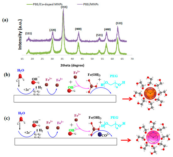 (a) XRD patterns of the PEG-MNPs and Co-doped PEG-MNPs; and (b,c) schematic mechanism of preparation of PEG-MNPs and Co-doped PEG-MNPs, respectively.