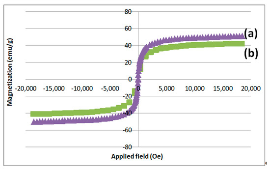 Figure 5 shows the VSM plots obtained for the synthesized MNPs. The most important parameters including the saturation magnetization (Ms), coercivity (Ce) and the remanence (Mr) quantities were extracted and compared: for PEG-capped MNPs, Ms = 49.52 emu/g, Mr = 0.72 emu/g and Ce = 1.45 Oe, while, for Co2+-doped PEG-MNPs, Ms = 41.55 emu/g, Mr = 0.66 emu/g and Ce = 1.02 Oe. From these magnetic data, it was recognized that the Ms values of PEG-capped and Co-doped MNPs declined because of surface capping by non-magnetic organic layer and crystal structure doping with Co2+ cations; however, the superparamagnetic behavior of these samples improved to the observed reduction in Ce and Mr values.