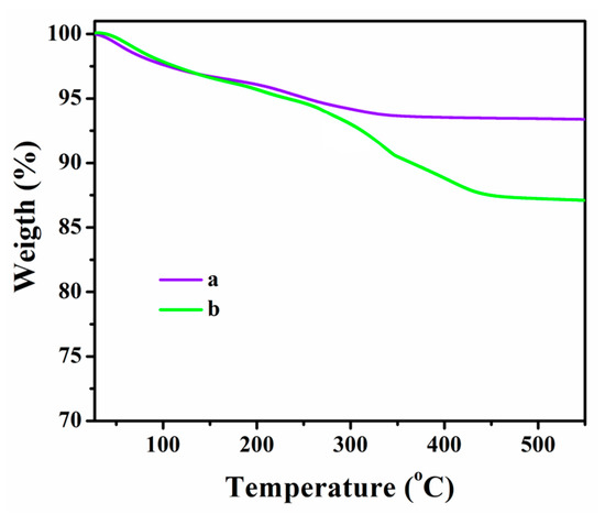 To compare the grafting percent of the PEG on the surface of MNPs and Co2+-doped MNPs, we used TGA by a PerkinElmer apparatus (STA-6000, Norwalk, CT, USA). The powder samples were heated in the temperature range of 25–550 °C with heating rate of 10 °C·min−1 under N2 flow circulation of 20 mL/min.
