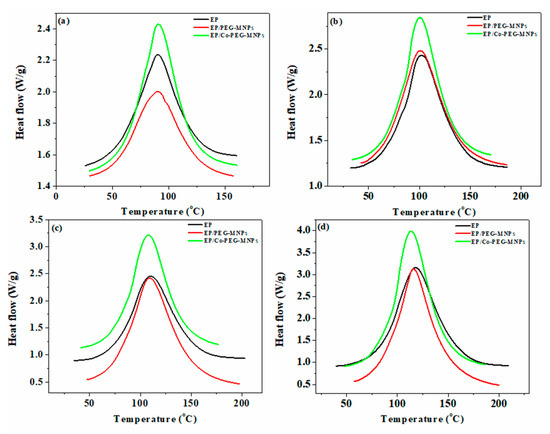DSC thermograms of EP, EP/PEG-MNPs and EP/PEG-Co-doped MNPs obtained nonisothermally carrying the heating rate (a) 5 °C·min−1, (b) 10 °C·min−1, (c) 15 °C·min−1 and (d) 20 °C·min−1
