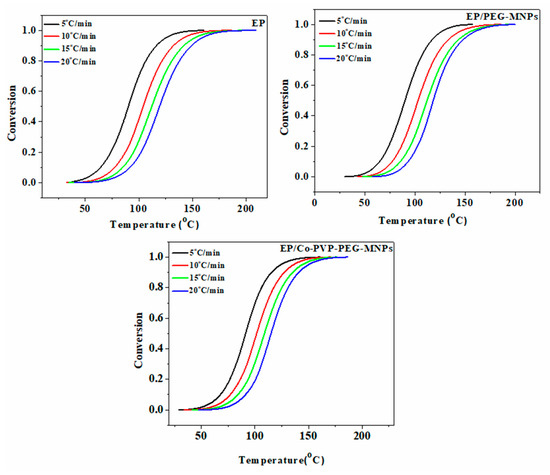 For EP/Co-PEG-MNPs nanocomposites, participation of the hydroxyl groups of the PEG in cure reaction accelerated the crosslinking by increasing the possibility of reaction at higher conversions [55]. The population of reactive hydroxyls assisted in cure reaction continuation once gelation and vitrification in the EP/Co-PEG-MNPs system were initiated. Thus, a significantly higher value of Eα of the assigned system with respect to the reference resin was the result of excessive interaction between epoxide and curing agents.