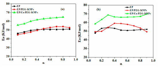 The variation of Eα for EP, EP/PEG-MNPs and EP/Co-PEG-MNPs nanocomposites according to: (a) the Friedman model; and (b) the KAS model.