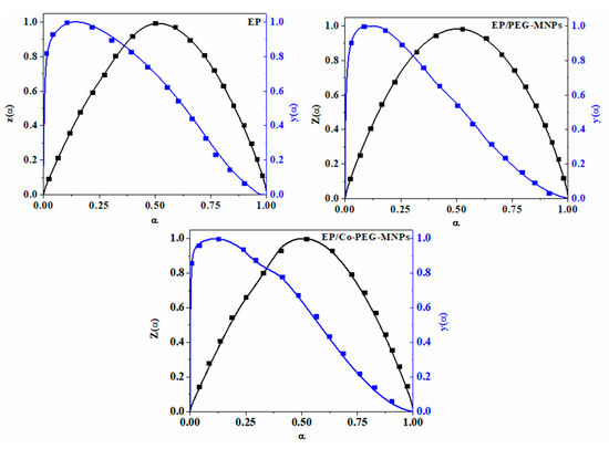 The values of y(α) and z(α) are normalized with respect to their maximum values to take values between 0 and 1 (see Figure 11) [56,57]. The values of αm, αp and αp∞ for the prepared samples are summarized in Table 2.