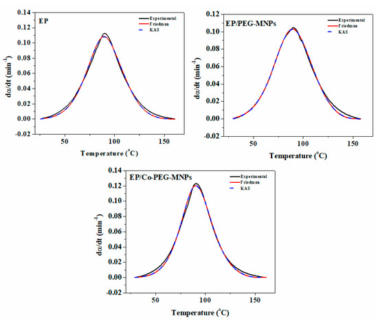 The values of Tg of the EP, EP/PEG-MNPs and EP/Co-PEG-MNPs were obtained in the reheating cycle from 20 to 250 °C at β of 10 °C·min−1 for the samples, and the results are reported in Table 4.