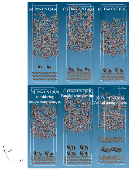 We arranged the epoxy resin, CNTs, and graphene from top to bottom in the z-direction and created a total of six types of three-phase structures: (a) two CNTs (4,4); (b) three CNTs (4,4); (c) two CNTs (8,8); (d) two CNTs (8,8), considering temperature changes; (e) four CNTs (8,8) parallel arrangements; (f) four CNTs (8,8) vertical arrangements. In the actual structure, CNTs adhered to the surface of the carbon fiber in a dispersed state. Models with CNTs (8,8) parallel and vertical arrangements were prepared, respectively, to simulate a similar structure. The molecular structures are shown in Figure 5. For the model with CNT (4,4) in Figure 5a,b, the cell size was (x, y, z) = (44.32, 38.38, 160.0) (Å). For the model with CNT (8,8) in Figure 5c–f, the size in the z-direction was 190.0 Å. CNT (8,8) had a larger diameter than CNT (4,4). Thus, we made room for the entire structure by extending the z-direction of the cell. The graphene placed at the bottom was fixed. We considered periodic boundary conditions in the x, y, and z directions. Table 1 shows the dimensions of the simulation cell and a CNT diameter, the number of CNTs, how to arrange CNTs, temperature change values of each model.