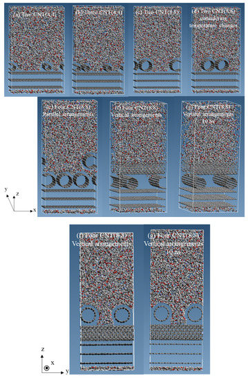 We observed the molecular behavior during relaxation in the NVT ensemble. In all six structure types, immediately after starting relaxation, the epoxy resin above the CNTs was drawn toward the fixed graphene. Next, we confirmed the cell compression in the NPT ensemble. The structure after relaxation in the NVT ensemble is shown in Figure 6, respectively. We then observed the molecular behavior of each model and observed that epoxy resin penetrated in between the CNTs in the model with CNT (4,4) but did not penetrate in between the CNTs in the model with CNT (8,8) (Figure 6a–d). In Figure 6, it appears that epoxy resin penetrated between the CNTs. However, no epoxy resin penetrated between the CNTs because of considering the periodic boundary condition in the y-direction. In other words, epoxy resin penetrated in between CNTs with a small diameter, but not CNTs with a large diameter. This is because larger CNTs had more benzene rings, and the π–π interaction was stronger than in small-diameter CNT. Thus, CNTs with a large diameter did not move away from each other. Furthermore, there was no significant difference in molecular behavior based on temperature change. We also considered the models with four CNTs (8,8) parallel arrangements and four CNTs (8,8) vertical arrangements (Figure 6e,f). One CNT in the upper region penetrated the lower region in the model with four CNTs (8,8) parallel arrangements. Similarly, no epoxy resin penetrated in between the CNTs, and an epoxy resin covered one CNT at the top. For the vertically arranged CNTs (8,8), epoxy resin approached the upper CNTs region, but no epoxy resin reached the CNTs at the bottom of the structure. When the relaxation time was 10 ns, the epoxy resin did not go any further down (Figure 6g). From this result, it can be inferred that the epoxy resin did not go further down even if the relaxation time was increased in nanoseconds. This is because the upper CNTs and the epoxy resin attracted each other due to interaction, and consequently, the epoxy resin did not approach the lower CNTs and graphene.