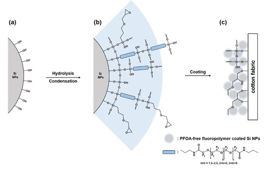 A dip–dry–cure process was used to fabricate OmniBlock-coated cotton fabric. Cotton fabric (20 × 20 mm) was immersed into the PFOA-free fluoropolymer-coated Si NPs solution for 10 min. The cotton fabric was then dried for 10 min at 80 °C and finally cured for 60 min at 120 °C. Prior to coating, activation of the cotton surface was performed with an Ar plasma generated at 100 W RF power, 20 sccm (standard cubic centimeter) and 200 mTorr for 100 s. The overall fabrication process of OmniBlock-coated cotton fabric is shown in Figure 1.