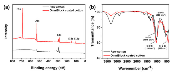 XPS was used to qualitatively characterize the changes in the surface chemical composition of the cotton fabric before and after the OmniBlock layer coating was applied. For the raw cotton fabric, only two peaks corresponding to C and O elements were observed at 290 eV (C 1s) and 536 eV (O 1s), respectively, as shown in Figure 3. After coating with OmniBlock, three new distinctive peaks appeared at 688, 154, and 103 eV, which were attributed to the F 1s, Si 2s, and Si 2p signals, respectively [62,63,64]. This suggests that PFOA-free fluoropolymer-coated Si NPs have covered the surface of the cotton fibers. Additionally, ATR-FTIR spectra of OmniBlock-coated cotton fabric support the covalent attachment of the PFOA-free fluoropolymer to the coated Si NPs (Figure 2b). The peak appearing at 1100 cm−1 is associated with the asymmetric stretching vibration of Si-O-Si bonds [65,66]. Other peaks at 800 and 480 cm−1 are associated with a Si-O-Si bond for the bending and vibration, respectively [67]. The peak at 1145 cm−1 represents a Si-O-C bond [68], confirming the Si NPs attachment to the cotton surface. Reportedly, the degree of condensation of the silsesquioxane networks is high even when precursors bearing long alkyl chains have been used [69,70]. Thus, we believe that the sol-gel reaction between Si NPs and fluorinated alkoxysilane may lead to a high degree of condensation.