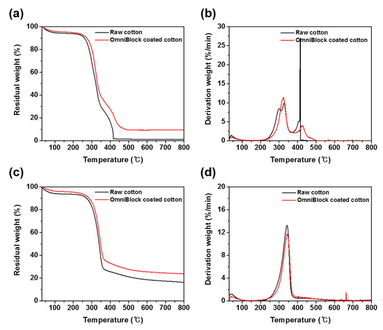 TGA and DTG curves of raw and OmniBlock-coated cotton fabrics (a,b) in air and (c,d) nitrogen.