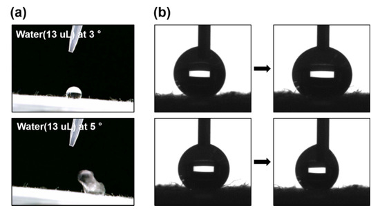 The captured images of (a) shedding angles for water and (b) the advancing angle measurement (top) and the receding angle measurement (bottom) for contact angle hysteresis.