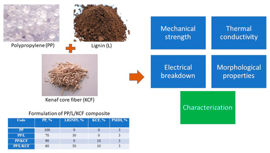 Lignin and kenaf core fibers have been reinforced into a PP polymer composite in this study. Generally, improved thermal stability and higher thermal diffusivity accompanied with comparable mechanical and electrical breakdown strength to that of pure PP was observed when both lignin and kenaf core fiber were incorporated into PP polymer. Tensile strength decreased when lignin and kenaf core fibers were incorporated into PP polymer. However, no significant different was recorded between pure PP and PP/L/KCF composites. Thermal stability of the PP composites was improved after incorporation of lignin and kenaf core fibers as indicated by increment in maximum degradation temperature. Investigation on thermal conductivity suggested that incorporation of kenaf core fibers and lignin did not yield significant changes in the conductivity of the PP composites. Nevertheless, PP/L/KCF exhibited lower volumetric specific heat and higher thermal diffusivity compared to the other PP composites. The results suggested that the PP composites fabricated in this study are suitable to be used as building insulating materials. On the other hand, all the PP composites surpassed the withstand voltage requirement as stipulated in IEC 60641-3, except for PP/L, suggesting that PP composites in this study are have potential to be used as dielectric or insulation material. In addition, SEM micrograph showed that better compatibility between PP matrix, lignin and kenaf core fiber was observed and therefore could be correlated well to the better mechanical strength of PP/L/KCF composite. This study has successfully filled the gap of knowledge on the thermal conductivity and electrical breakdown properties of kenaf core fiber- and lignin-reinforced PP composites. Despite that, future study is still needed in order to improve the interaction and adhesion between polymer matrix and kenaf core fibers and lignin.