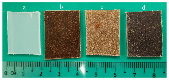 Apparent image of (a) PP, (b) PP/lignin (L), (c) PP/KCF, and (d) PP/L/KCF composites.