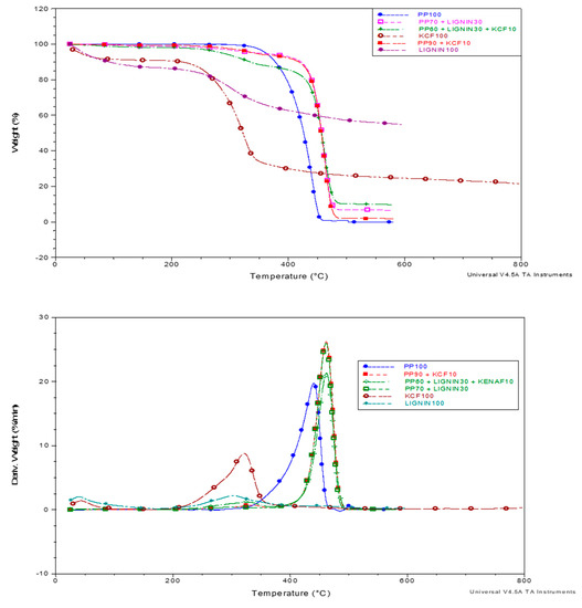 TGA (top) and DTG (bottom) curves of PP and its composites.