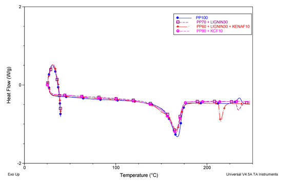 Table 4 shows the heat flows into the materials during heating by using DSC and Figure 4 illustrates the DSC curves of PP and its composites. A previous study has observed that the glass transition temperature (Tg) of pure PP polymer at around 0 °C exhibited a brittle property [34]. It can be observed that the peak of Tg for PP composites is absent in Figure 4 as the Tg is below the temperature regime used in the DSC study. The insertion of kenaf or lignin component has resulted in the occurrence of two melting peaks where there is only one peak found in pure PP. Han et al. [35] attributed the existence of two melting peaks to the size distribution of crystalline lamella if the melting points are not produced due to the matrix polymorphism. The first melting point (Tm1) occurred at 150 °C and 151.1 °C, respectively, for PP/KCF and PP/L. However, a drop of Tm1 value for PP/L/KCF composite to 110.4 °C was observed. Besides, in comparison with the pure PP polymer and its composites, the DSC results show a slight decrease in second melting temperature (Tm2) of PP/L/KCF composite specimen. This might be due to the fact that the kenaf fibers create hindrance in the melting of PP polymer [36]. On the other hand, incorporation of kenaf fiber and lignin together in PP polymer composite have possibility to reduce the total energy needed to break up the PP polymer chains in composite.