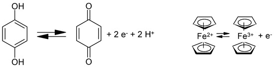- Beasley, C.A.; Murray, R.W. Voltammetry and redox charge storage capacity of ferrocene-functionalized silica nanoparticles. Langmuir 2009, 25, 10370–10375. [Google Scholar] [CrossRef]