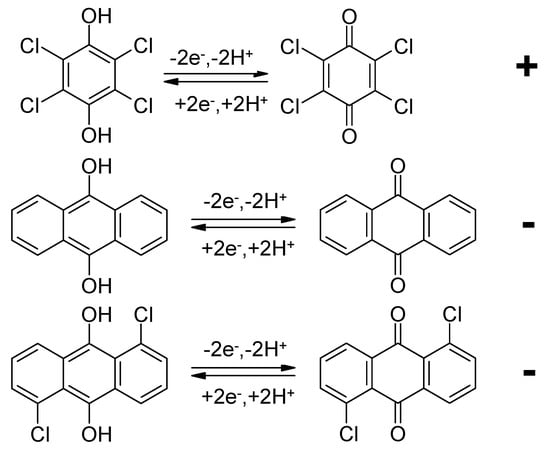 - Weissmann, M.; Crosnier, O.; Brousse, T.; Bélanger, D. Electrochemical study of anthraquinone groups, grafted by the diazonium chemistry, in different aqueous media-relevance for the development of aqueous hybrid electrochemical capacitor. Electrochim. Acta 2012, 82, 250–256. [Google Scholar] [CrossRef]