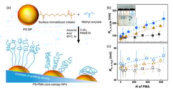 Using SI-ATRP, the PMA chains were successfully grafted from the surface of initiator immobilized PS NPs prepared by miniemulsion, and resulted in the formation of PS NPs having PMA canopies with different σ and varying N (Table 1). The increase in size created by the grafting of the PMA canopy resulted in a larger solvodynamic radius (Rs) for the samples with longer PMA chains or higher σ (Figure 1b); similar results were also observed in the dry state by TEM measurements (Figure S3, Supplementary Material).