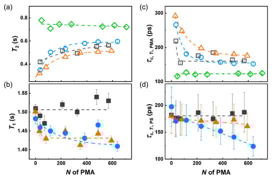 (a) 1H spin–spin relaxation time of methoxy group of the PMA canopy and (b) 1H spin-lattice relaxation time of aromatic ring of the PS core in the PS–PMA NPs with different degrees of polymerization of the PMA chains (N) grafted on PS cores with different grafting density, measured at 298 K by using an NMR spectrometer at a Larmor frequency of 700.02 MHz; (c) Correlation time of 1H of methoxy group of PMA canopy obtained from T2 relaxation and (d) correlation time of 1H of the aromatic ring of PS core obtained from T1 relaxation, calculated from BPP theory. For PS-PMA NPs with low (0.17 chains nm−2, □), medium (0.8 chains nm−2, △), high (2.5 chains nm−2, ○) grafting density and free PMA chain (◇).