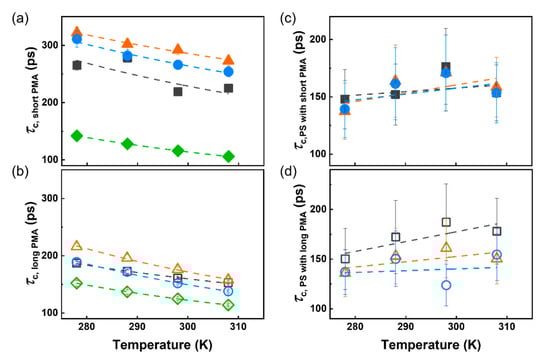 The variation of the τc of a solvated polymer at different temperatures (Figure 3) can be described as an Arrhenius relation, where the activation energy associated with the subsegmental relaxation of the chains (Figure 4a,b) is a measure of the cooperativity of the segmental movement [,,]. As the temperature increased, the τc of the PMA chains decreased as expected (Figure 3a,b), since higher temperatures increase the local subsegmental mobility of the polymer. However, in the case of the PS core, the τc increased with an increase in the temperature (Figure 3c,d). This unexpected result is related to the deswelling of crosslinked PS observed at high temperatures in specific solvent systems (Figure S6 Supplementary Material, ) [,].