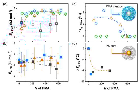 The energy of activation of the PMA chains of PS-PMA core-canopy NPs was calculated using the τc measured at different temperatures (Figure 4a). As expected, the activation energy associated with the subsegmental dynamics of the untethered PMA chains did not change significantly with N. However, short grafted chains displayed lower activation energy than the free chains, indicative of a decrease in the degree of cooperativity associated with the relaxation process, in keeping with the conformational changes of the PMA chains upon grafting when the chains adopted a partially stretched conformation. As the N increases, the difference in the extent of cooperativity of the relaxation process between the grafted chain and the free chains decreased. As a result of the limited weight fraction of PMA in the PS-PMA samples prepared at a low σ, the measurements were not as precise, and no clear conclusion to the effect of the σ can be drawn. In the case of the PS core, the results are more complex; the deswelling of the PS core led to the reduction in the local subsegmental mobility of the PS core and resulted in apparent negative activation energy for the relaxation process (Figure S4, Supplementary Material). Nonetheless, the results clearly show that the grafting of the PMA chains facilitated the relaxation of the PS core, and this effect was more pronounced for long chains grafted with σhigh and σmedium than with σlow.