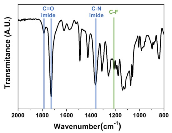 The chemical structures of synthesized 6FDA-TFMB were observed using FTIR spectroscopy, as shown in Figure 1. It shows distinctive bands at 1727 and 1787 cm−1 for C=O symmetric and asymmetric stretch, and 1362 cm−1 for C–N stretch of imide. A peak at 1211 cm−1 for C–F stretch is also found.