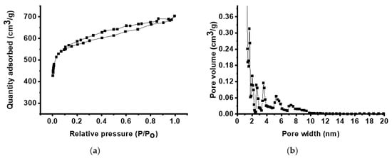 Fourier-transform infrared (FTIR) spectroscopy was recorded using a Nicolet 6700 (Thermo Scientific, Waltham, MA, USA) at a 4 cm−1 resolution using a liquid-nitrogen-cooled mercury cadmium telluride (MCT) detector. Thermogravimetric analysis (TGA) was carried out with a TGA7 (Perkin-Elmer, Waltham, MA, USA) by heating the 6FDA-TFMB up to 800 °C at a heating rate of 10 °C min−1 under nitrogen. Scanning electron microscopy (SEM, SU8220, Hitachi, Japan) was measured to investigate the surface morphology of the precursor and carbon nanofibers. Carbon microstructures were observed with a Raman spectrometer (inVia reflex, Renishaw, Wotton-under-Edge, UK) with a 780 nm laser. The surface and pore properties of the activated CNFs were characterized using N2 adsorption/desorption isotherms measured on a Quantachrome (Autosorb-iQ and Quadrasorb SI, Quantachrome, Boynton Beach, FL, USA).