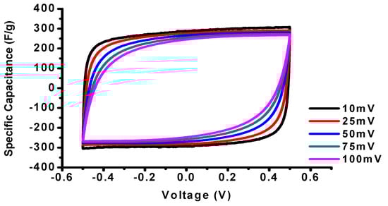 In Figure 6, CNF electrodes derived from 6FDA-TFMB show rectangular CVs without faradaic peaks with a high specific capacitance of 292.3 F g−1 at 10 mV s−1. As the scan rate increases from 10 to 100 mV s−1, the specific capacitance is decreased from 292.3 to 246.1 F g−1 due to the limited interaction between the electrolyte ions and the electrode surface.