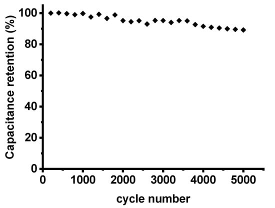 To evaluate cycling stability, CVs were measured for 5000 cycles and the specific capacitance at 100 mV s−1 for every 100 cycles is shown in Figure 7. CNF electrodes derived from 6FDA-TFMB exhibit a capacitance retention of 89.2% after 5000 cycles, which is comparable to those from PAN.