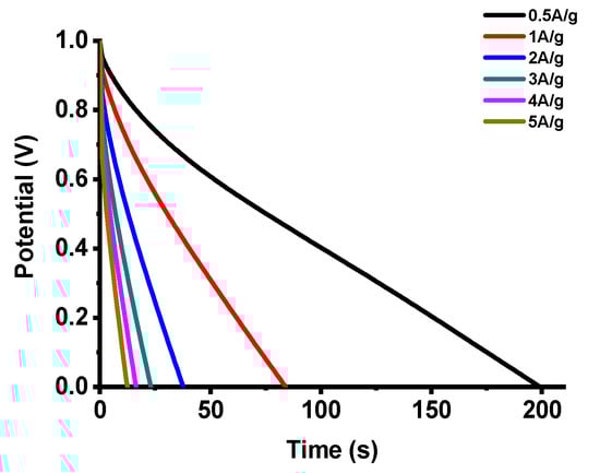 The galvanostatic charge–discharge test was carried out with a voltage range of 1.0 to 0 V and a discharge current density range of 0.5 to 5 A/g. From the discharge curves, energy density (E, Wh kg−1) and power density (P, W kg−1) were calculated using Equations (2) and (3) as follows: