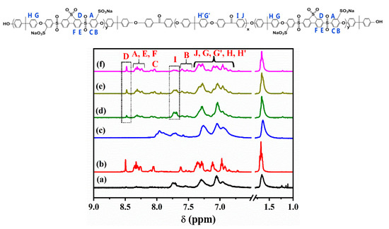 At first, we synthesized a sulfonated BCPSBP (sBCPSBP) according to a previous study[7]. Afterward, we placed the sBCPSBP (6.00 g, 7.80 mM), BPA (1.96 g, 8.58 mM), K2CO3 (2.40 g, 17.2 mM), toluene and DMAc in an RB flask and proceeded process in the same manner as described for the oligomer A. 1H NMR (600 MHz, DMSO-d6) δ 8.6–7.2, 7.2–6.6, 1.8–1.4; FT-IR (KBr, cm−1) 3448, 3066, 2968, 1585, 1503, 1465, 1307, 1238, 1153, 1116, 1076, 1028, 881, 825, 709, 684, 616, 558.