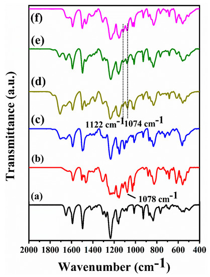 We derived A from DCBP and BPA monomers. We used sBCPSBP and BPA as monomers to synthesize the B. We used the A and B oligomers to synthesize the di-block (AB) and tri-block copolymers (ABA and BAB) (Scheme 1). To determine the chemical structures, we dissolved the hydrophobic oligomer, hydrophilic oligomer, control copolymer, tri-block copolymer (ABA or BAB) and di-block (AB) copolymer in DMSO-d6 solvent and analyzed the resulted using NMR spectroscopy (Figure 1). The signals observed between 7.8 and 6.8 ppm were assigned to the aromatic protons of hydrophobic oligomer. The H’ and G’ signals between 7.3 and 6.7 ppm were due to aromatic phenylpropane protons and I signal between 7.8 and 7.66 ppm was from the benzophenone group. The signals between 1.7 and 1.4 ppm were related to the hydrophobic oligomer’s biphenyl propane methyl group. On the other side, NMR spectra of hydrophilic oligomer contained aromatic phenyl ring protons with sulfonate groups. A–F was the lowest signal in the 8.55–7.3 ppm range. Signals between 1.85 and 1.40 ppm confirmed biphenyl propane methyl group presence. The tri-block copolymer (ABA and BAB) and the di-block copolymer (AB) had significant signals in the 8.50 to 6.82 ppm range. These arise from aromatic hydrophobic and hydrophilic proton units. We calculated the degree of sulfonation (DS of hydrophilic oligomer is 50% and used it to synthesize AB, ABA and BAB copolymers. The I signal’s decreasing intensity (7.81–7.62 ppm) from ABA to AB to BAB indicates a hydrophobic oligomer ratio reduction. The D signal’s increasing intensity (8.53–8.45 ppm) from ABA to AB to BAB indicates an incremental polymer hydrophilic ratio increase. A signal in the 7.41–7.16 ppm range indicates a small quantity of non-sulfonated hydrophilic fragments. FT-IR spectra of A, B, control, AB, ABA and BAB membranes are displayed in Figure 2. In the case of copolymers, the absorption band observed at 1013 cm−1 was assigned to the stretching vibration of diphenyl ether units. In contrast, the absorption band at 1465 cm−1 was related to the stretching vibration of C=C in the polymer backbones. The B, AB, ABA and BAB had the absorption bands at 1122 and 1074 cm−1, which were attributed to the sulfonic acid groups. The DCBP, BPA and sBCPSBP monomers were also subjected to 1H NMR and FT-IR analysis to confirm their usage during polymer synthesis. The obtained results are given in Supporting information (Figures S1 and S2).