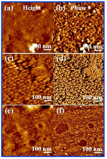 Two-dimensional atomic force microscope (AFM) height images of (a) AB, (c) ABA and (e) BAB membranes; 2D AFM phase images of (b) AB, (d) ABA and (f) BAB membranes.