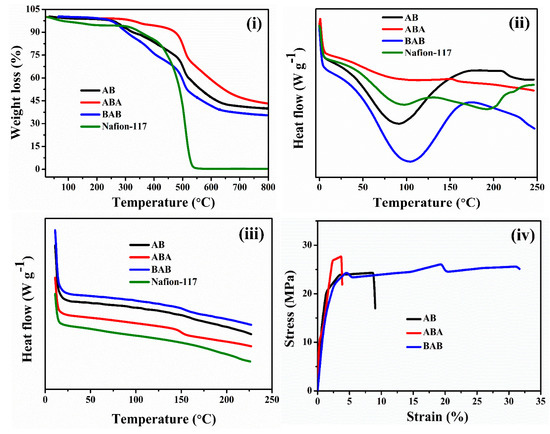 Thermomechanical stabilities of membranes. (i) TGA curves; (ii) differential scanning calorimetry (DSC) first scan; (iii) DSC second; (iv) mechanical stability curves of AB, ABA, BAB and Nafion-117 membranes.
