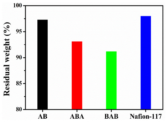 We performed the Fenton test to scrutinize the SPAES membranes oxidative stability. After immersing membranes in Fenton’s solution for 12 h, the BAB membrane lost 8% of its original weight, whereas the AB and BAB membranes lost only 6% and 3%, respectively (Figure 6). The higher amounts of OH available in the BAB membrane’s sulfonic acids and phenol groups favor direct free radical reactions (OH• and OOH•) with polymer chains, causing accelerated membrane degradation. Since the AB and ABA membranes have a comparatively low sulfonic acid group density, their degradation is lower.