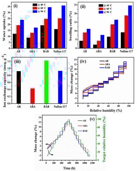 Figure 7 shows AB, ABA, BAB and Nafion-117 membrane physiochemical characteristics: water uptake, swelling ratio IEC and water sorption. The BAB membrane had a higher water uptake at different temperatures than the AB and ABA membranes because of the high density of sulfonic acid groups and large number of hydroxyl groups present in BAB’s structure (Figure 7i). This led to strong water absorption and retention [28,29]. The membrane’s swelling ratio is dependent to that of water uptake. The maximum swelling ratio was found to be 16.5% at 90 °C for the BAB membrane, which is nearly 1.4- and 2.1-fold higher than those of AB and ABA membranes, respectively (Figure 7ii). The BAB membrane’s high swelling ratio was due to high water uptake in all three dimensions. The BAB membrane also has enhanced IEC as given in Figure 7iii. This is because of the higher sulfonic acid group density in polymer backbones, which facilitates H+ the ion mobility. We scrutinized the membrane’s surface hydrophilicity using water sorption measurements and found the BAB membrane’s water sorption to be higher than that for AB and ABA membranes (Figure 7iv,v). The water sorption increased as hydrophilic oligomer ratio increased in polymer chains and is further supported by water-contact angle characteristics, as displayed in Figure 3d–f.