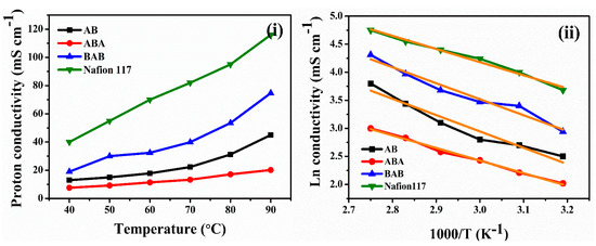 Taking into account the significance of membrane’s proton conductivity during fuel cell operation under slightly low RH, proton conductivity of AB, ABA and BAB membranes was quantified at 80% RH and plotted in Figure 8i. The BAB membrane revealed the conductivities of 19.0, 30.0, 32.4, 39.9, 53.5 and 74.7 mS cm−1 at 40, 50, 60, 70, 80 and 90 °C, respectively, while ABA and AB attained relatively lower conductivities at same temperatures. High density of sulfonic acid groups, owing to the maximized proportion of hydrophilic oligomer in BAB membrane, would be responsible for high proton conductivity of BAB membrane. We calculated the activation energy (Ea) for ion conduction using the Arrhenius plot by Arrhenius formula as provided below.