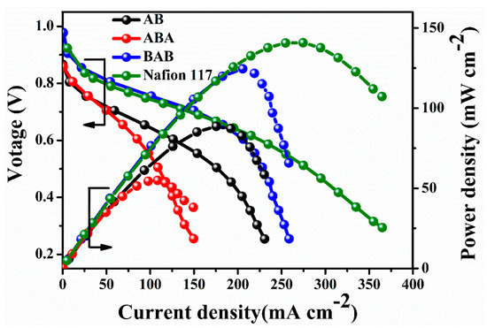 We incorporated the AB, ABA, BAB and Nafion-117 membranes into MEAs and measured PEMFCs with H2/O2 at 60 °C and 80% RH (Figure 9). The AB membrane performed reasonably; the power density reached 88.6 mW cm−2 at a 175 mA cm−2 current density. As hydrophobic oligomer ratio increased, however, cell performance worsened. The cell power density with an ABA membrane was only 54.9 mW cm−2 at a 108.7 mA cm−2 current density. This indicates that the ABA membrane’s ohmic impedance and proton conduction decreased dramatically due to decreasing acidic group concentration. By comparison, the BAB membrane’s cell performance remained higher, with a cell power density reaching 124.5 mW cm−2 at a 206.3 mA cm−2 current density. The enhanced cell performance partly stemmed from good proton conduction, which reduced electrolyte resistance and increased the rate of the cathode reaction. The BAB membrane cell reached a performance level close to that of the Nafion-117 membrane cell (140.8 mW cm−2 at a 274.9 mA cm−2 current density). This result suggests that the BAB membrane is suitable for potential PEMFC technology.