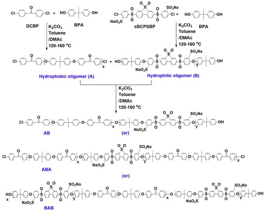 Proton-exchange membranes (PEMs) are gaining great attention as both ion conductors and reactant separators for various energy storage/conversion devices such as fuel cells, solar cells and secondary batteries [1,2,3,4]. Among various fuel cells, proton-exchange membrane fuel cells (PEMFCs) have various inherent benefits such as high energy density and efficiency, trivial pollution contributions and quick startup times [5]. Because of these benefits, they are competitive with traditional batteries and combustion engines as clean power sources for automobiles and stationary applications [6,7]. Due to their high ion conductivity and extended chemical stability, perfluorosulfonic acid (PFSA) membranes—especially Nafion—are widely utilized as PEMs for PEMFCs [8,9,10]. PFSA membranes are by no means perfect, however. They are expensive, exhibiting low proton conductivity at high temperatures and low relative humidity (RH) and are highly permeable for fuels. Proton conductivity degradation is caused by Nafion’s inability to retain water in ionic clusters [11]. Moreover, high fuel crossover of Nafion from anode to cathode owing to its direct pathway for fuel permeation [12]. These drawbacks hinder Nafion’s widespread commercialization. Sulfonated poly(arylene ether sulfone) (SPAES) are a hydrocarbon material containing sulfone and ether bridges [13,14]. They are the most commonly adopted material for PEM fabrication because of their design and fabrication flexibility, low price, tunable proton conductivity and film-forming ability [15]. One inherent limitation of the SPES membrane is its low mechanical integrity and, thereby, PEMFC durability. This low mechanical integrity is caused by a high degree of sulfonation or maximum hydrophilic fragment proportion in SPES. A low sulfonation degree or minimal hydrophilic fragment proportion can also be problematic due to decreased water absorption and proton conductivity [15,16]. It is highly desirable to fabricate SPES with equal proportions of hydrophilic and hydrophobic units for PEM applications, since this would offer reasonable ion conductivity, as well as dimensional, thermal and mechanical stability [17,18,19]. In the SPES block copolymer, hydrophilic units provide the ability to conduct protons and uptake water, whereas hydrophobic unit enhance, thermal, mechanical, dimensional and oxidative stabilities of membranes. There are many types of SPES-based block copolymer membranes available that have high ion conductivity, a comprehensive mechanical modulus and thermal stability. While effects of variations in oligomer ratio on mechanical properties, chemical properties and proton conductivity have been studied extensively, there is little understanding of SPES block copolymer membrane suitability for fuel cell application.