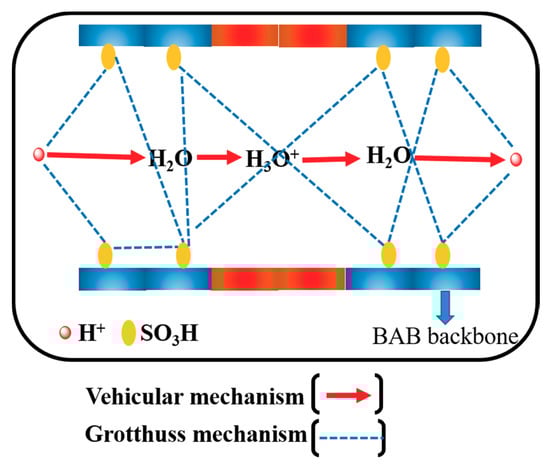 Schematic illustration for proton-transfer mechanisms through BAB polymer structure.