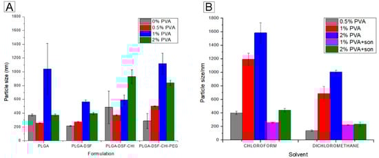 (A) Mean particle size obtained for formulations using acetone as the organic phase, and different concentrations of PVA in the aqueous phase. (B) Mean particle size obtained for formulations containing PLGA, chitosan and PEG with either chloroform or dichloromethane as the organic phase, different concentrations of PVA in the aqueous phase, and sonication.