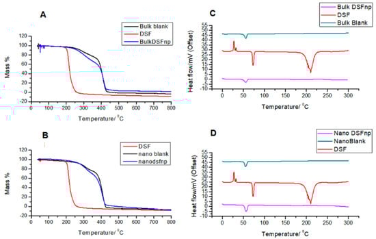 Graphs showing thermal degradation profiles of disulfiram, blank and loaded nanoparticles: (A) blank formulations. (B) microfluidic formulations. Relative DSC curves are shown with offset heat flow values for comparison: (C) emulsification solvent evaporation formulations. (D) microfluidic formulations.