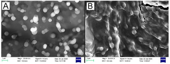 Scanning electron micrographs of nanoparticles prepared by emulsification solvent evaporation (A) and microfluidic (B) methods.