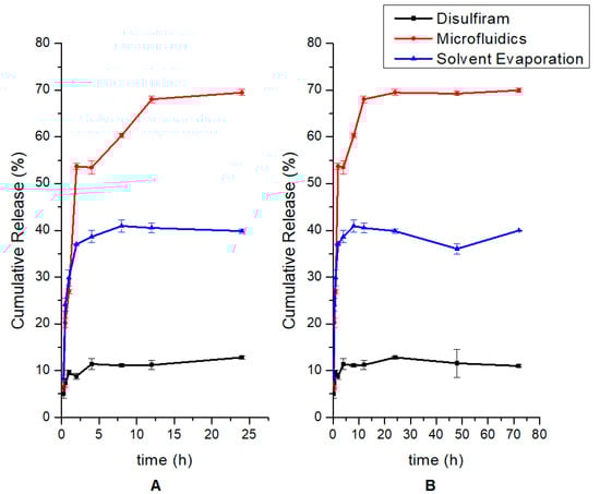 (A): 24 h and (B): 72 h cumulative in vitro release profiles of native disulfiram, emulsification solvent evaporation and microfluidic nanoparticles.