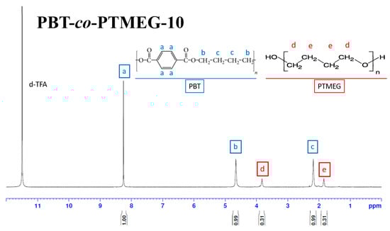 Figure 1 shows the chemical structure, and the comonomer composition of PBT-co-PTMEG -10 copolymer, as observed by 1H-NMR spectroscopy []. Resonance peaks of PBT-co-PTMEG copolymers were identified and assigned in: Peak a (8–8.5 ppm) corresponds to the aromatic protons of the terephthalate units. Peak b and peak c (4–4.5 and 2–2.5 ppm) are ascribed to the proton signals of O(CH2)4O in the PBT segment. Peak d and peak e (3.5–4 and 1.5–2 ppm) are ascribed to the proton signals of O(CH2)4O in the PTMEG segment. Chemical structures of PBT-co-PTMEG copolymers were confirmed. The composition of PTMEG within PBT copolymers can be calculated by Equation (1):