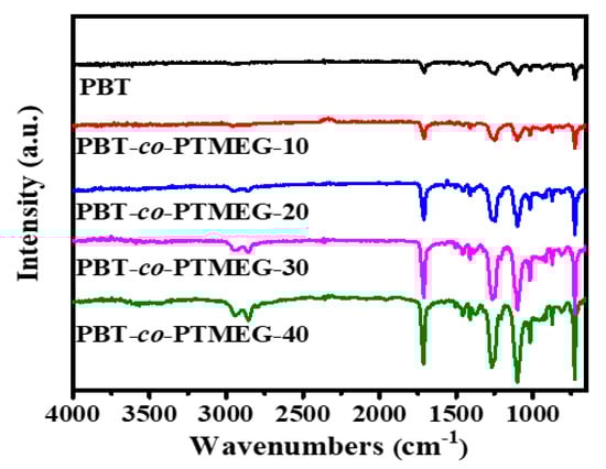 Figure 2 displays the FT-IR spectra of synthesized PBT-co-PTMEG copolymers, the characteristic absorption peaks related to the (CH2)4 of ether-ester at 727 cm−1, the stretching vibration of the -COO- absorption of the PBT ester group at 1274 cm−1, C=O of the PBT ester group at 1713 cm−1, the C-O-C backbone vibration of PTMEG at 1099 cm−1, and the -CH2- stretch vibration of PTMEG at 2861 and 2944 cm−1 []. The intensity of corresponding peaks was enhanced with the increase in PTMEG concentration, suggesting that PBT-co-PTMEG copolymers were synthesized successfully.