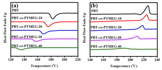 DSC curves of PBT and PBT-co-PTMEG copolymers in (a) 1st cooling process and (b) 2nd heating process at a rate of 10 °C min−1.