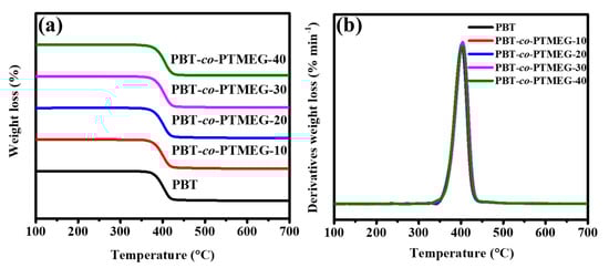 Figure 4a,b display the thermal decomposition and derivatives weight loss curves for PBT-co-PTMEG copolymers. All samples show a single-step decomposition track in the whole process. The 5% weight loss temperature (Td-5%) was located at around 369 to 371 °C. In other research, a reduction in thermal stability may be found while a high content of soft segment exists, which makes the Td-5% drop significantly []. The comparable value of Td-5% for PBT-co-PTMEG copolymers, indicating excellent thermal stability, was maintained while being copolymerized with PTMEG into PBT below 40 wt%.