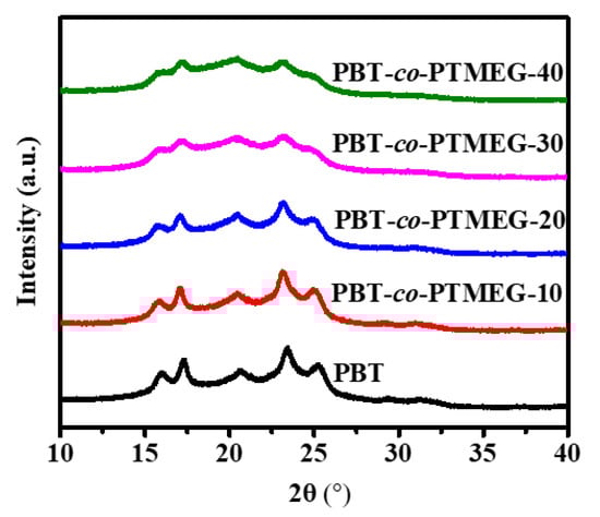 Figure 5 presents the XRD results of PBT-co-PTMEG copolymers in a 2θ range of 10–40°. Five characteristic peaks of XRD of PBT-co-PTMEG copolymers were carried out around the 2θ values of 15.8°, 17.1°, 20.4°, 23.1°, and 25.0° for the crystal lattices of , respectively, which corresponded to the α-form as neat PBT, demonstrating no phase transition from α to β on PBT domains with the incorporation of PTMEG [,,,,,,] despite some changes in the peak intensity. The attenuation of intensity, related to a reduction in crystallinity, could be explained by the fact that the incorporation with PTMEG would limit crystallization due to the disruption of the PBT regular chain, where this result exhibits an excellent relationship by DSC analysis.